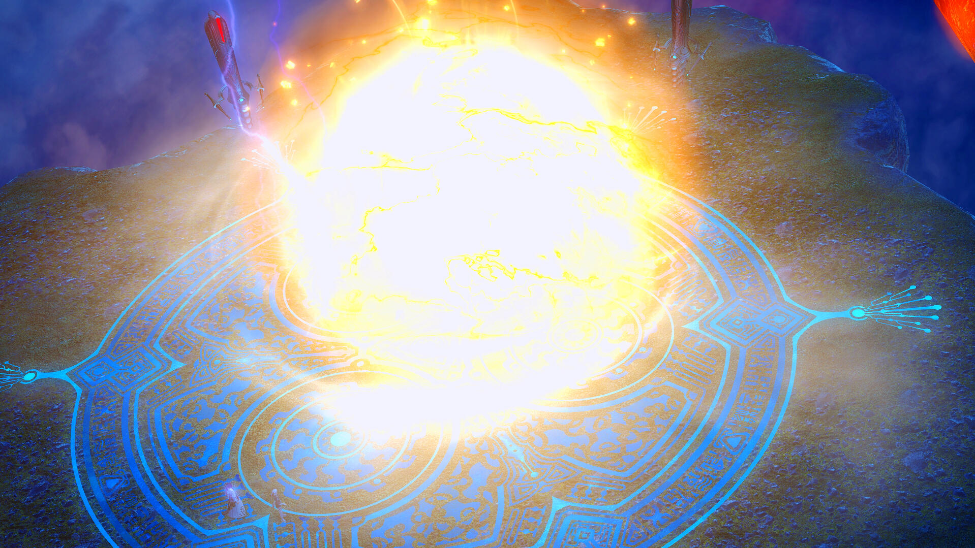 Standing in front of M.D., I squinted my eyes shut concentrating on keeping the barrier active. This was all I could do to protect him now. The might of Nael's meteor bared down upon us. We could feel the force pushing through the shield, slowly withering away at it. I knew it wouldn't be long before her will overthrew mine. My throat was dry. I swallowed in sorrow, knowing what I had to do. Then, making the hardest decision of my life, I ripped my fae companion, Selene, from the air and crushed her into my tome. She vanished into a cloud of golden dust, rejuvinating my shield. Nael's eyes glowed with bloodlust and she threw her head back laughing her gastly laugh. The halbert, Bradamante, continued to sap more aether from Dalamud, feeding into her ignited sphere and causing it to continue growing in size. The binding on my scholar book was beginning to burst, it's once high-quality fibers now frayed at the seems. I called back to M.D.,"Her sacrifice was in vain...I can't hold it..."