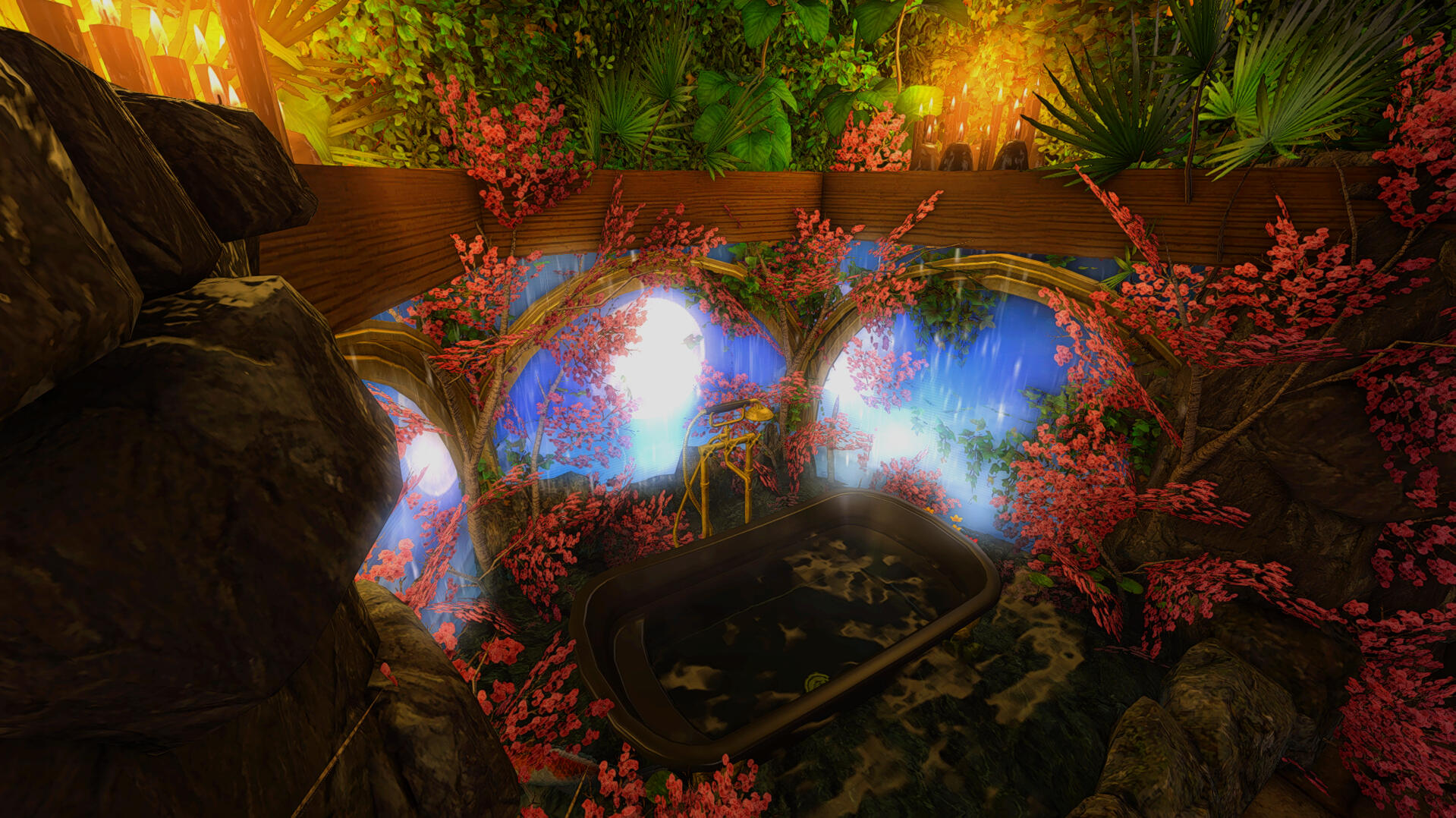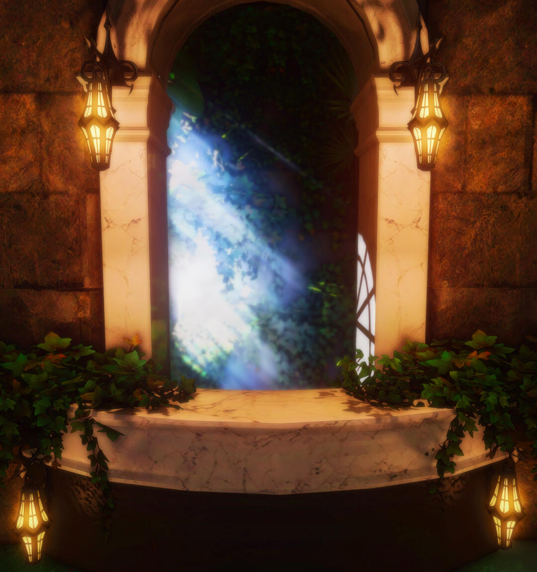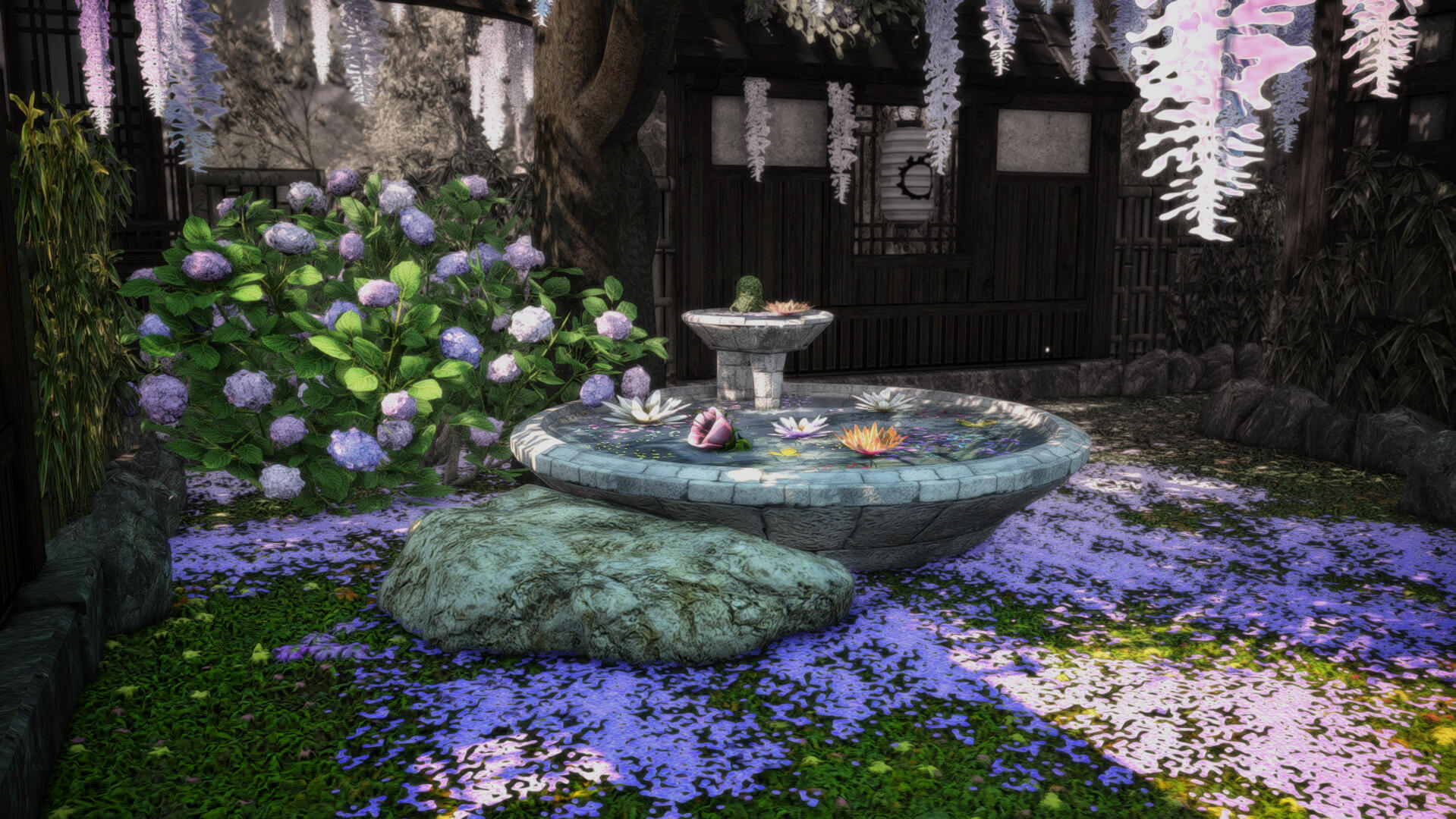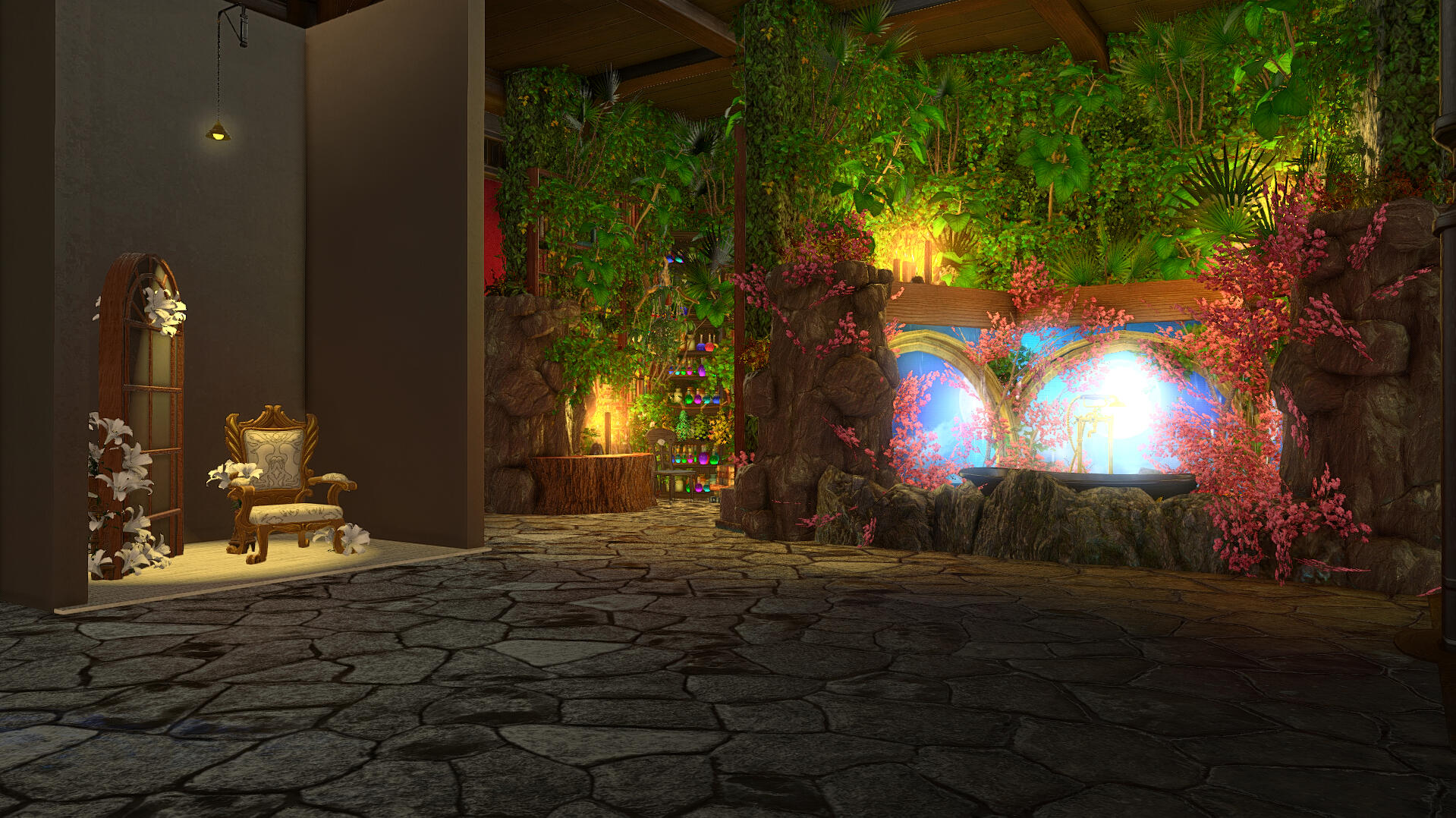 When you arrive its very obvious you made it to the right place by how beautiful the landscaping is - clearly meant for outdoor photography! Items like a rock pond, fountain, and sauna are available for use. Each shaded by a vibrant wisteria tree canopy. Ranging from foral bath scenes, marble archways, and even a set I'd personally describe as *"post-apocalyptic steampunk," the interior sets are all unique beautifully intricate. * Each set is placed for a limited amount of time, about a month, so be sure to check back often to make use of the new designs!