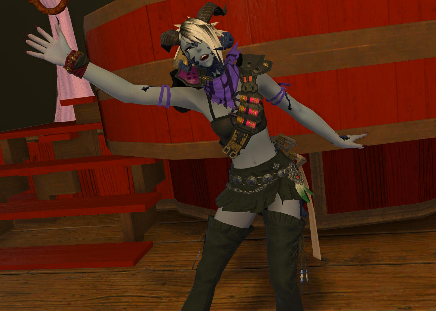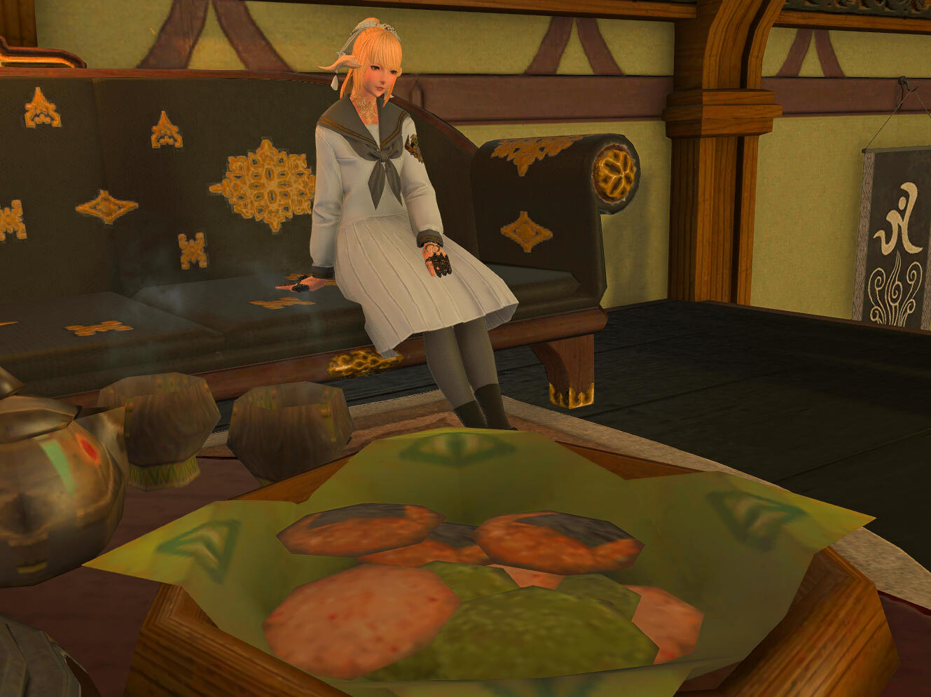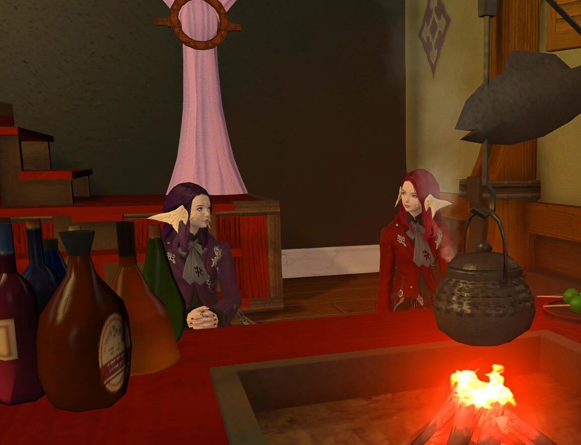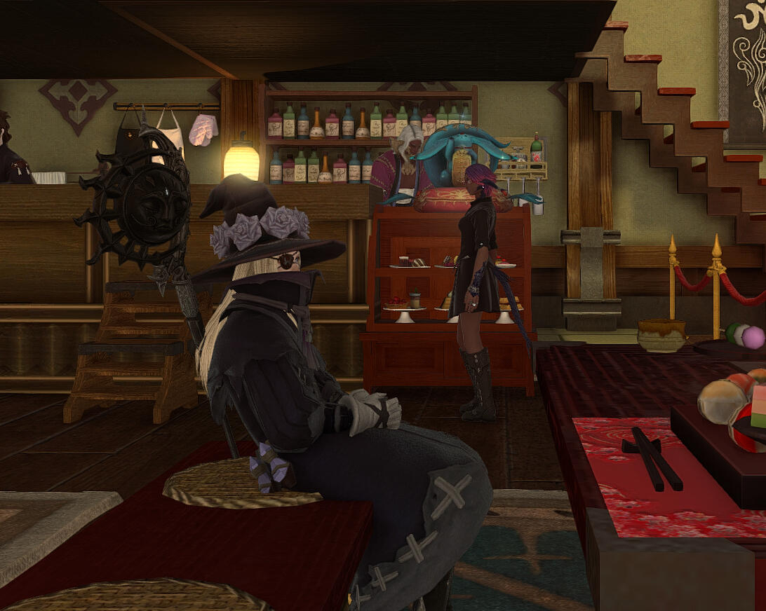 Yuukimura: "This past year has seen some interesting events, like a couple of former Imperial soldiers looking for a drink and a rest, a rather tense night that was.... But one fond moment happened somewhat recently. About half of my Free Company decided to come over and hang out, check the place out. And a member decided to dance around as a prancing pachyderm, was quite an interesting display. But, I had joined not too long ago and it felt great having that kind of support. Now I have one friend that's a sort of gremlin who likes to sit under the stairs and relax. I do tell people to make themselves at home, I'm just glad people can unwind here and feel at ease after a hard day."Aether Entertainer: A gremlin you say? Oh dear. Well I do also want to talk about your menu. Can you tell me about the process for putting it together? Also, I know that I can't be the only one wondering how an ex sky pirate turned Maelstrom aquired the culinary expertise to steep such satisfying teas and bake such delicate sweets...?