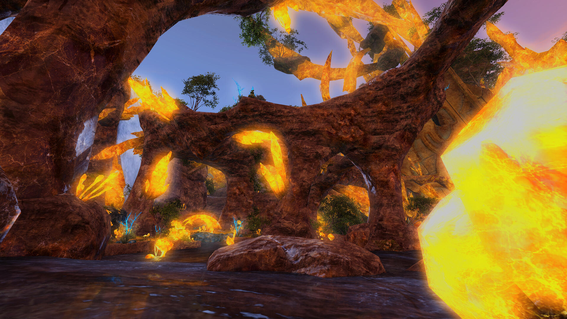 In a sudden flash of crimson light the platform shattered beneath our feet. "Ahhh!" Our voices echoed in unison as we fell what felt like 30 malms down through a blinding cloud of ash and rubble. We landed with a thud, our eyes were met with an eerily familiar scene. One who's horror I had only lived through via history books at the University. The destroyed silhouette of the allagan tower was painted over a crimson sky where Dalamud still hung low. Lesser wyverns circled overhead, making jittering sounds in anticipation of a meal. Heavy allagan collars were clasped tightly around their necks. Coughing from the pollutant, I rolled onto my side toward M.D. who seemed dazed and was trying to stagger to his feet. I managed to choke out,"She's taken us to the Rivenroad..."